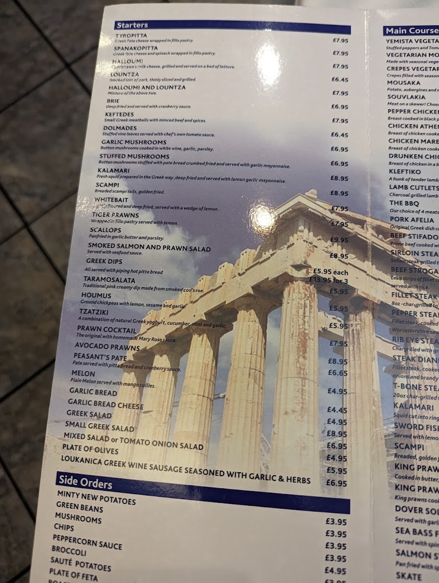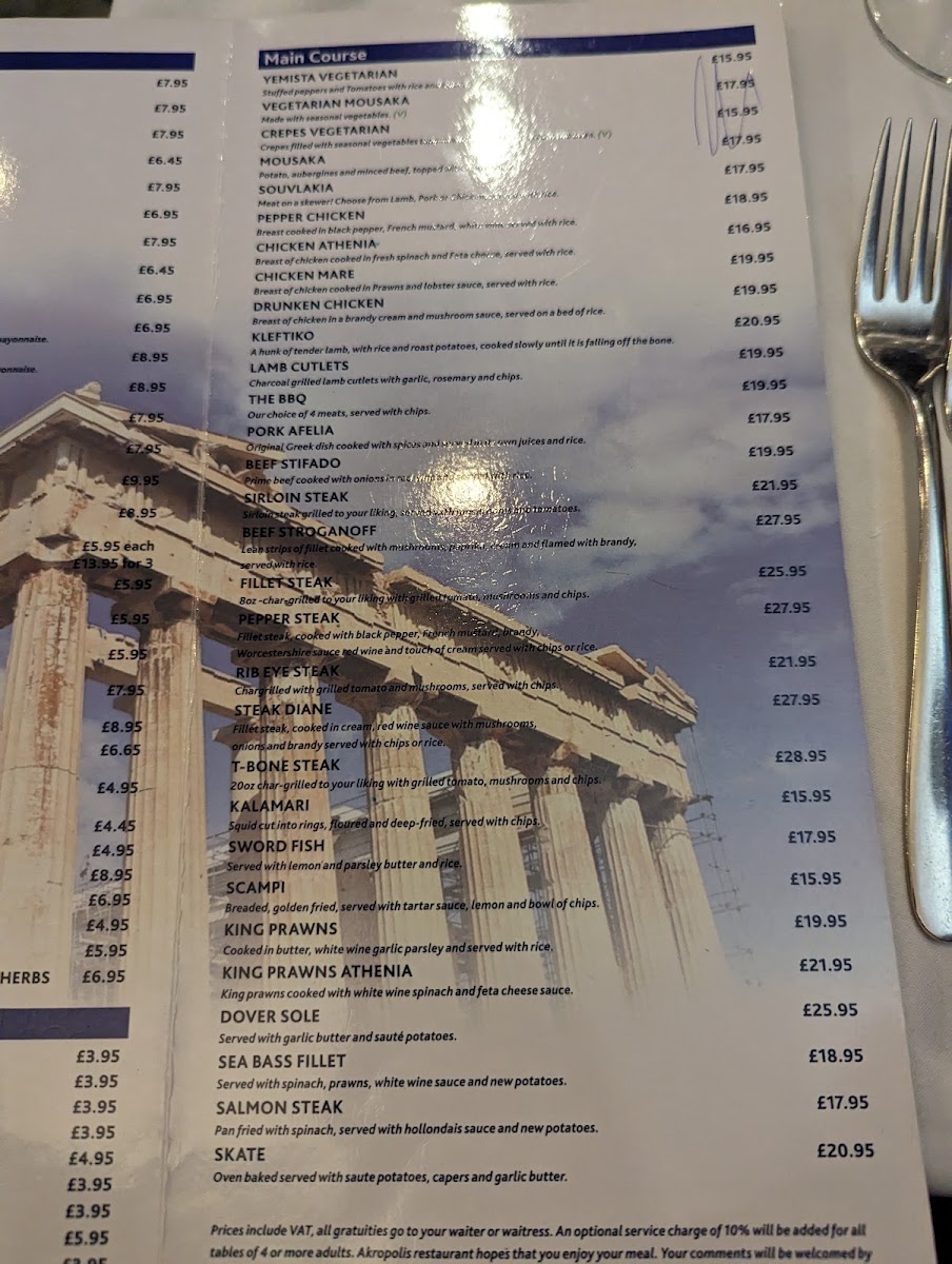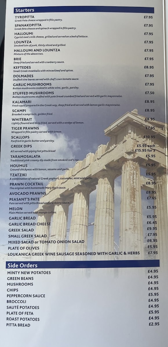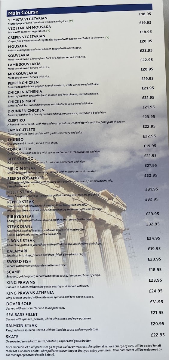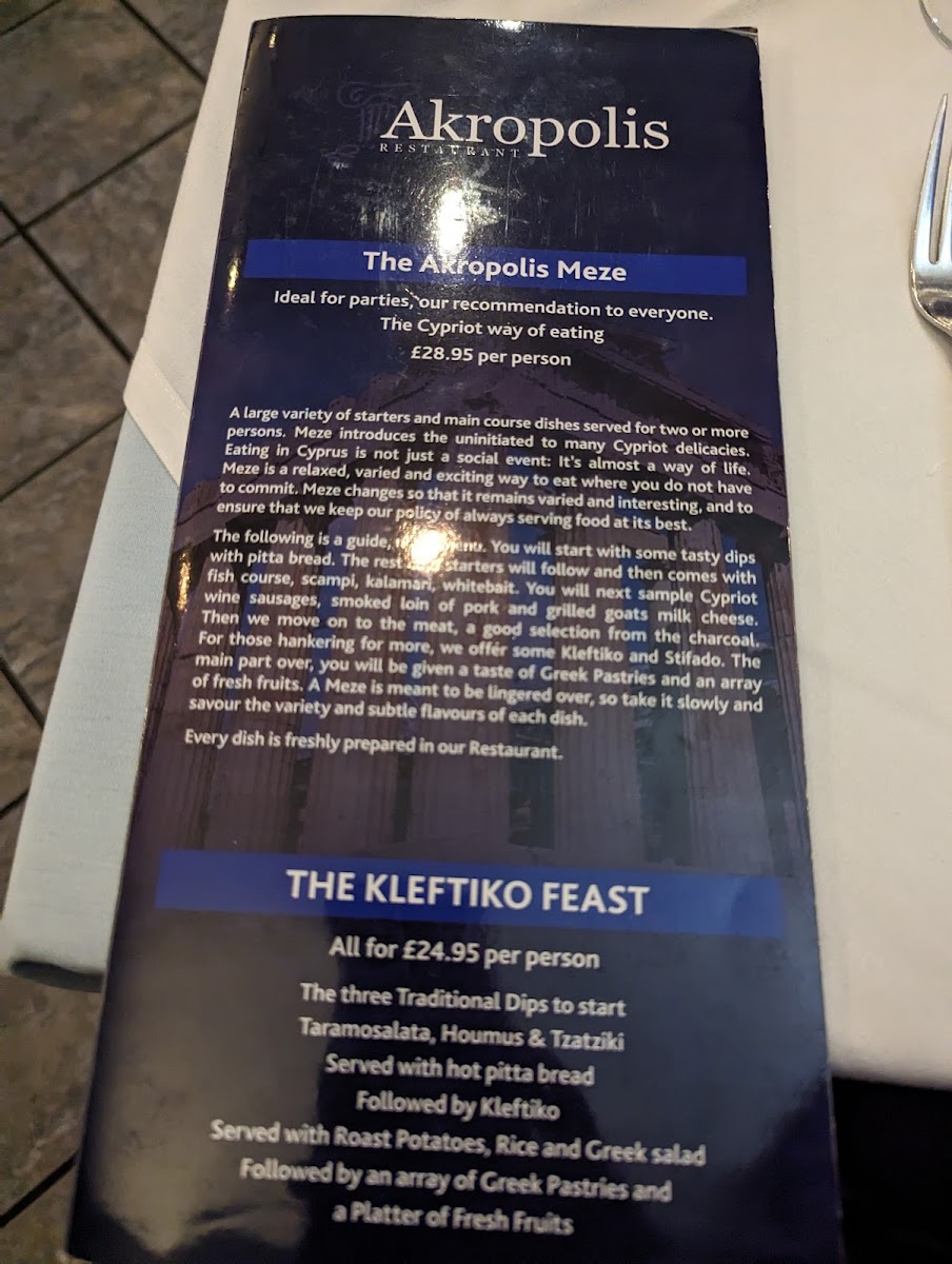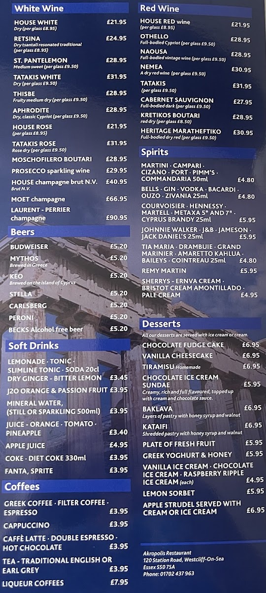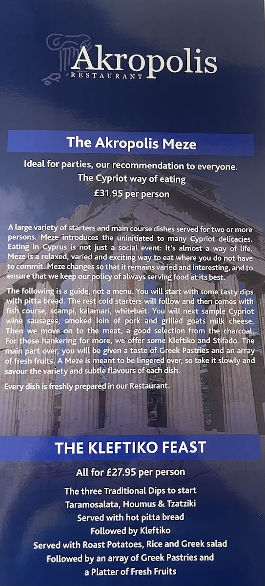 At Akropolis Restaurant in Southend-on-Sea, guests are invited to experience authentic Greek and Cypriot cuisine. The menu showcases an enticing array of starters and main dishes, highlighting fresh, high-quality ingredients packed with flavor. Standout starters include Tyropitta and Spanakopitta, both filled with creamy feta cheese wrapped in delicate fillo pastry, and Halloumi, grilled and served on a fresh bed of lettuce. The generous offerings, such as the beloved Pork Afelia and Lamb Kleftiko, evoke memories of sun-soaked tavernas and intimate family dinners. Diners rave about the impeccable service, cozy ambiance, and vibrant flavors, making it a perfect spot for those seeking an exceptional dining experience. The carefully curated wine list complements the menu beautifully, providing excellent pairings for every dish. Each meal feels like a gateway to Greece, reminding you of its rich culinary tradition.